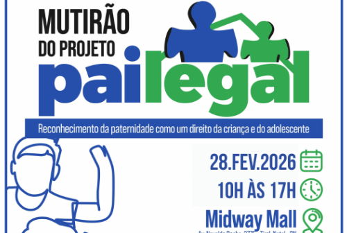 O Ministério Público do Rio Grande do Norte (MPRN) irá realizar o primeiro mutirão do ano de 2026 do Projeto Pai Legal. O evento de reconhecimento de paternidade acontecerá no dia 28 de fevereiro, das 10h às 17h, no 1º piso do Shopping Midway Mall, com oferta gratuita de exames de DNA. A ação terá vagas limitadas e quem deseja garantir o atendimento pode fazer o agendamento via whatsapp (84) 99972-5249.
