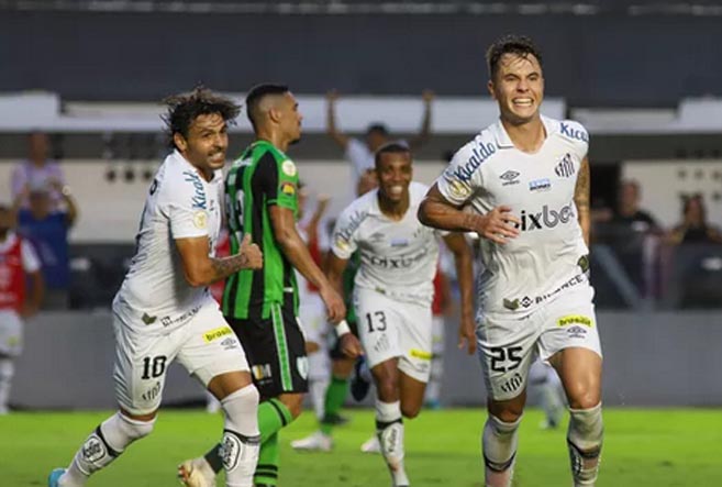 Vinícius Zanocelo comemora o terceiro gol do Santos diante do América-MG