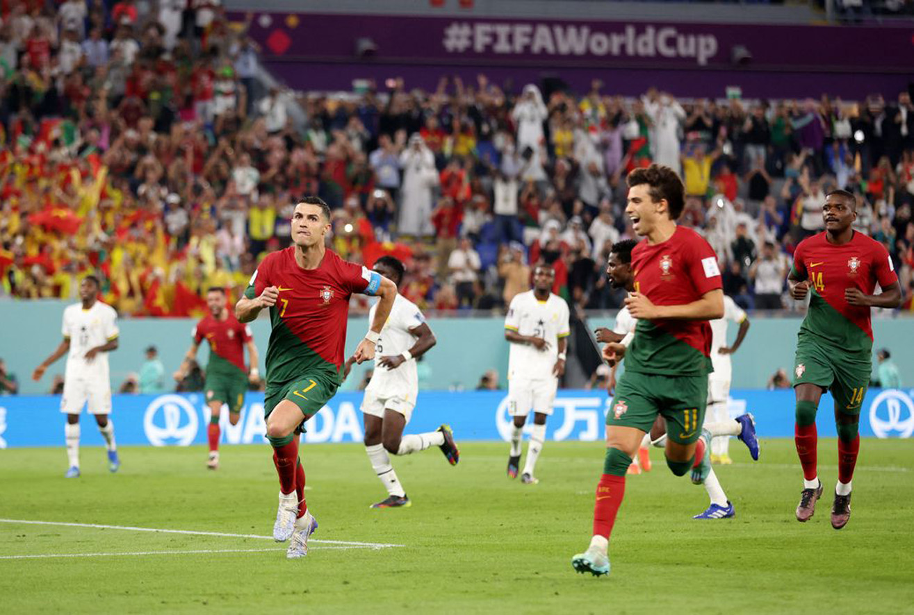 Aos 17 minutos, Cristiano Ronaldo se jogou na área de Gana, o árbitro marcou pênalti, mas os jogadores africanos pressionaram para que Ismail Elfath consultasse o VAR (árbitro de vídeo). O juiz deu de ombros para as reclamações e CR7 foi para a cobrança, perfeita, estufando as redes do goleiro Ati. Com este gol, o português se tornou o primeiro jogador da história ao marcar ao menos uma vez em cinco Copas diferentes.
