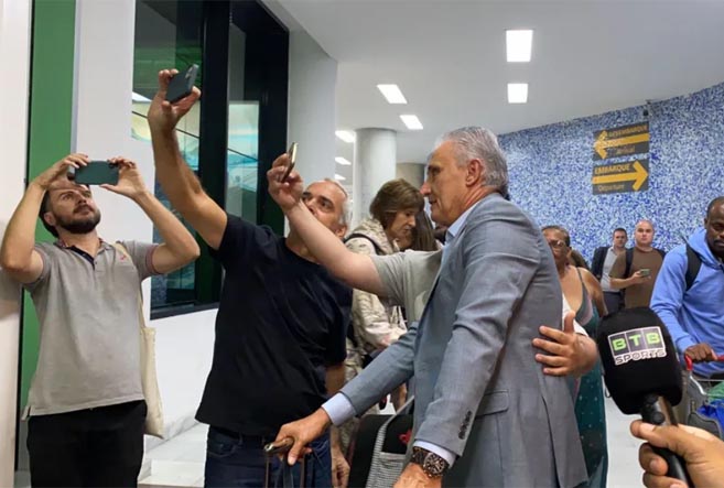 Tite atendendo torcedores em desembarque no Rio de Janeiro