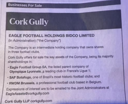 Num anúncio publicado na sexta-feira no diário inglês "Financial Times", a Cork Gully vai direto ao ponto: afirma que possui participação em três clubes de futebol e que "coloca à venda os principais ativos da empresa, nomeadamente as suas participações maioritárias" em alguns ativos. Entre eles, a SAF do Botafogo, "um dos clubes mais históricos do Brasil"; o RWDM Brussels, "um clube de futebol profissional baseado na Bélgica"; e o francês Olympique Lionnays.