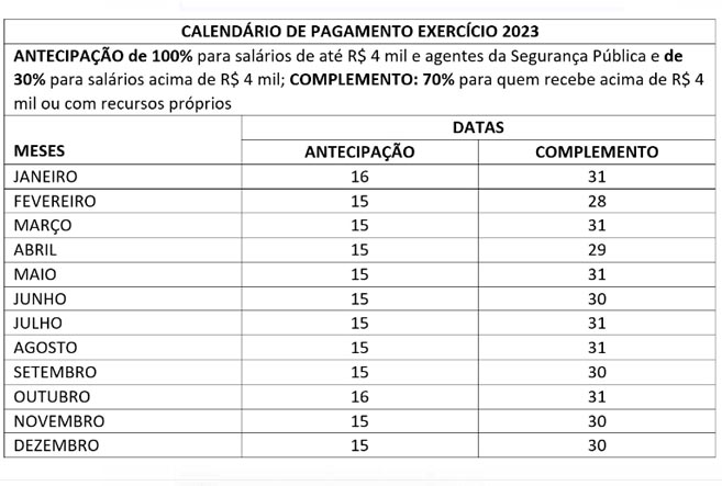 De acordo com o calendário, a antecipação integral dos salários – no dia 15 de cada mês – continuará para quem recebe até R$ 4 mil e integralmente para agentes das forças de segurança, independente dos valores.