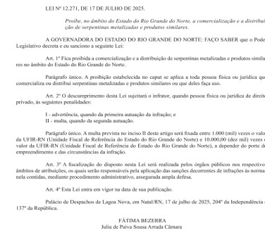 O Diário Oficial do Estado do Rio Grande do Norte (DOE-RN) traz em sua edição desta sexta-feira (18), a publicação da Lei Nº 12.271/2025 assinada pela Gov. Fátima Bezerra. O ato normativo proíbe a comercialização e distribuição de serpentinas metalizadas e produtos similares em todo o território potiguar. A Lei já está em vigor e prevê a aplicação de advertência – em caso de primeira autuação da infração - e multa entre R$ 1 mil e R$ 10 mil quando da segunda autuação a pessoas físicas e jurídicas.