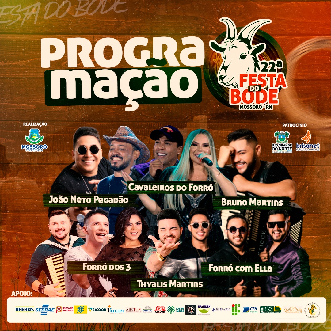 A organização da 22ª Festa do Bode divulgou nesta quinta-feira (4) as atrações musicais do evento que celebra neste ano a 22ª edição. A festa será realizada de 11 a 14 deste mês no Parque Armando Buá.