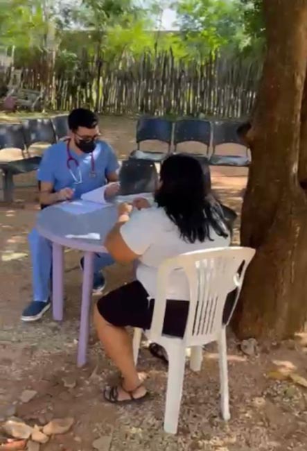 Profissional atende paciente na sombra de uma árvore