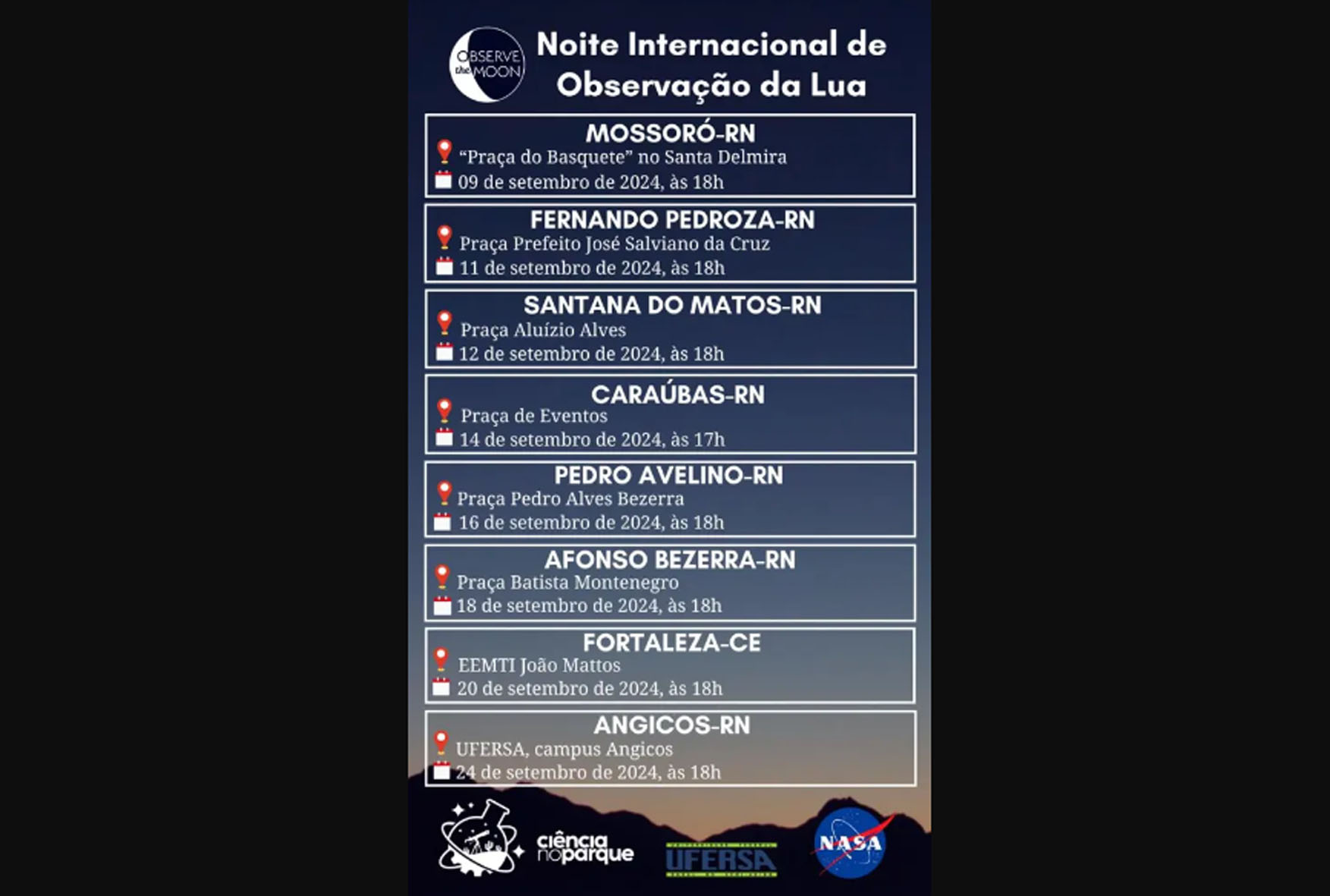 A programação do mês de setembro segue uma agenda de popularização da ciência proposta pela NASA, agência espacial estadunidense, e conta com a coordenação do professor Gustavo Rebouças, coordenador do Ciência no Parque no campus de Angicos da Ufersa.