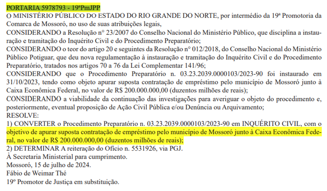 O Ministério Público do Rio Grande do Norte (MPRN) vai investigar o empréstimo de R$ 200 milhões contraído pela gestão do prefeito Allyson Bezerra (União Brasil) junto à Caixa Econômica Federal (CEF). Por meio da 19ª Promotoria do Patrimônio Público da Comarca de Mossoró, o Procedimento Preparatório n. 03.23.2039.0000103/2023-90 foi convertido em inquérito civil para apurar a transição financeira.
