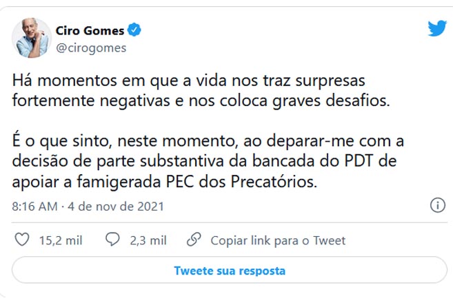 “Há momentos em que a vida nos traz surpresas fortemente negativas e nos coloca grandes desafios. É o que sinto agora, neste momento, ao deparar-me com a decisão de parte substantiva da bancada do PDT de apoiar a famigerada PEC dos Precatórios. A mim, só resta um caminho: deixar minha pré-candidatura em suspenso até que a bancada do meu partido reavalie a sua posição”, disse Ciro Gomes, no seu perfil no Twitter.