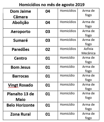 Ainda de acordo com a publicação, os bairros Dom Jaime Câmera e Abolição lideram a estatística de homicídios em agosto. Cada somou quatro mortes por arma de fogo e outros instrumentos. Aeroporto e Sumaré vem logo atrás com três homicídios.
